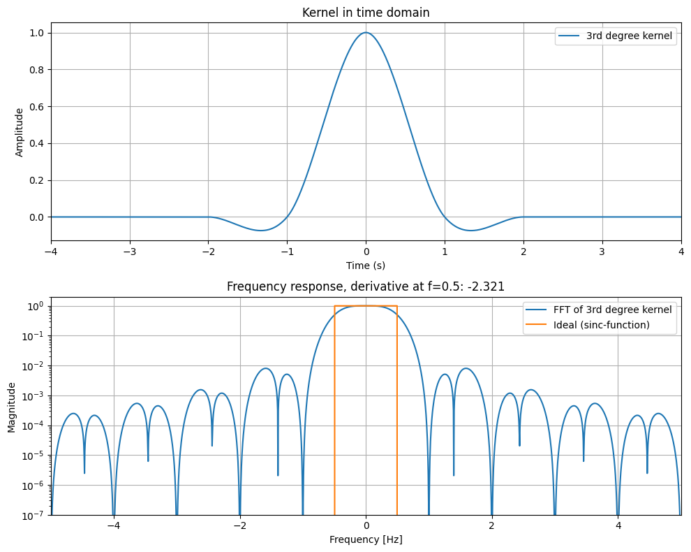 As visible from the plot below, it features a wide range of options in terms of accuracy: Kernels which yield nearest neighbor, linear, cubic, quintic etc. interpolation, all the way up to highly smooth C11 continuous 7th order accurate 13th degree interpolation (I derived these highly accurate kernels myself using SymPy).