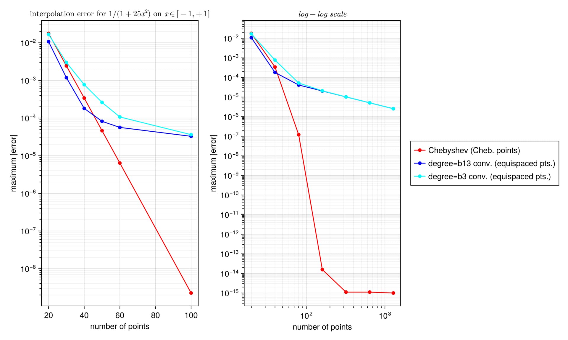 #legend(["Chebyshev (Cheb. points)", "degree=b13 conv. (equispaced points)", "degree=b3 conv. (equispaced points)"])