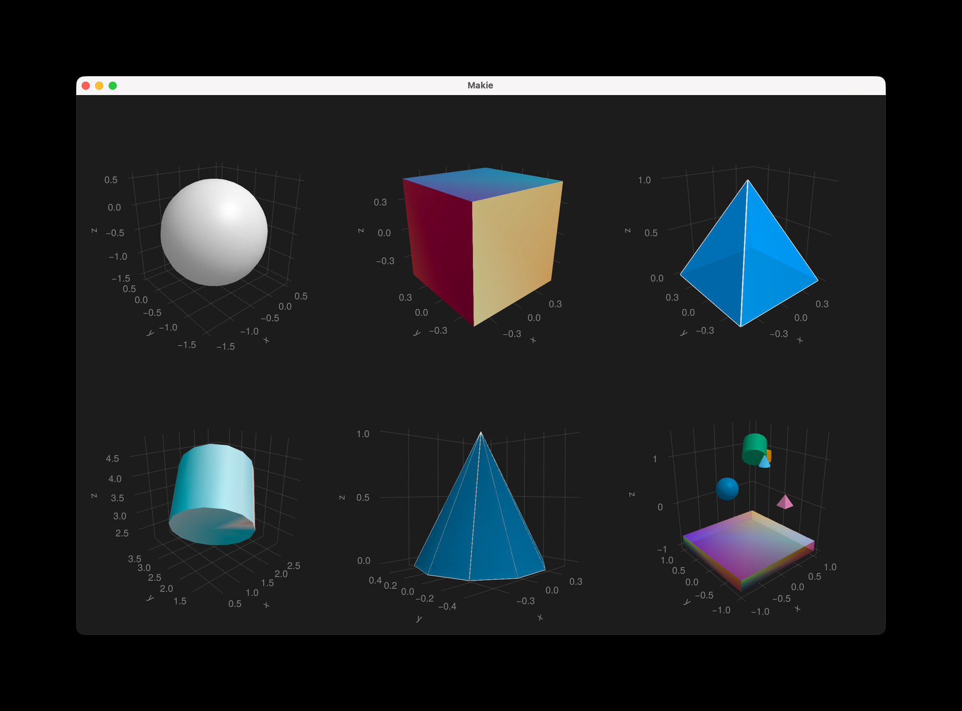 I’m trying to learn how to use GLMakie having had a lot of success with CairoMakie. But I immediately ran into issues. VSCode is my main text editor, and whereas I’ve never had an issue with CairoMakie, I can’t say the same here. This example comes from the mesh section on the Beautiful Makie website, but I cannot run it. From the closeall() function to the basic geometry types, I keep getting that the functions are undefined. Any help would be greatly appreciated.